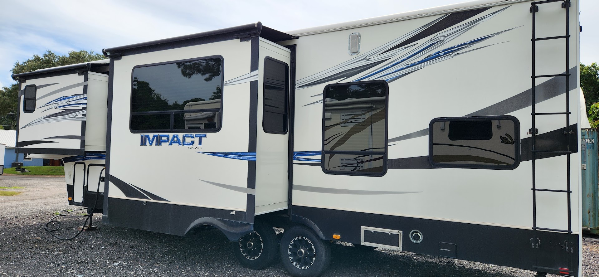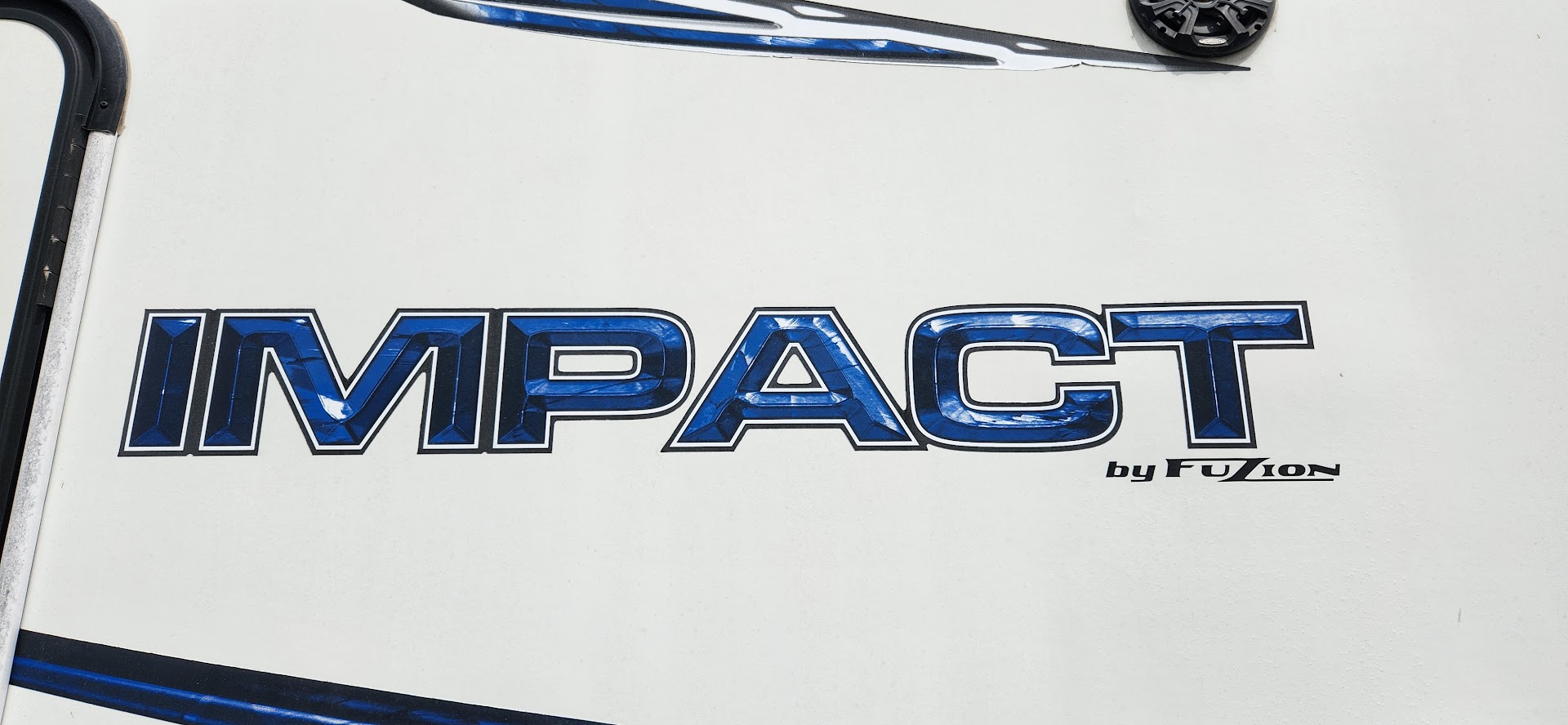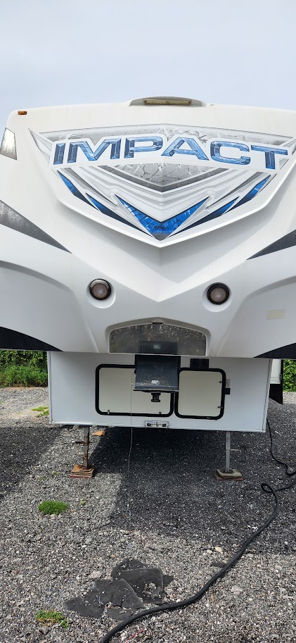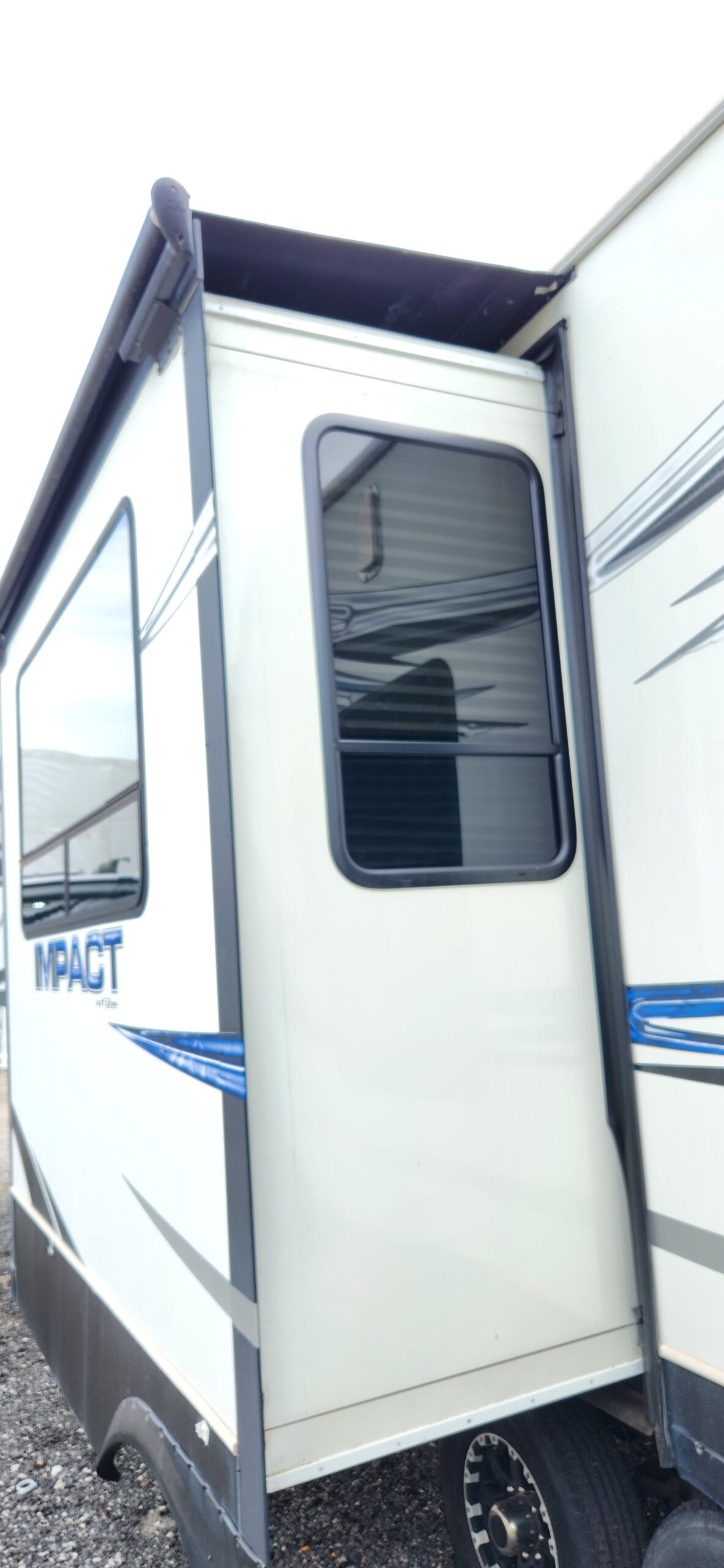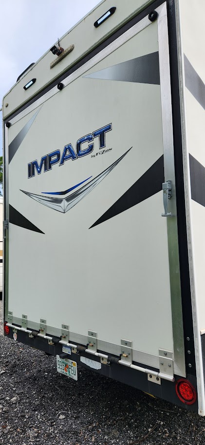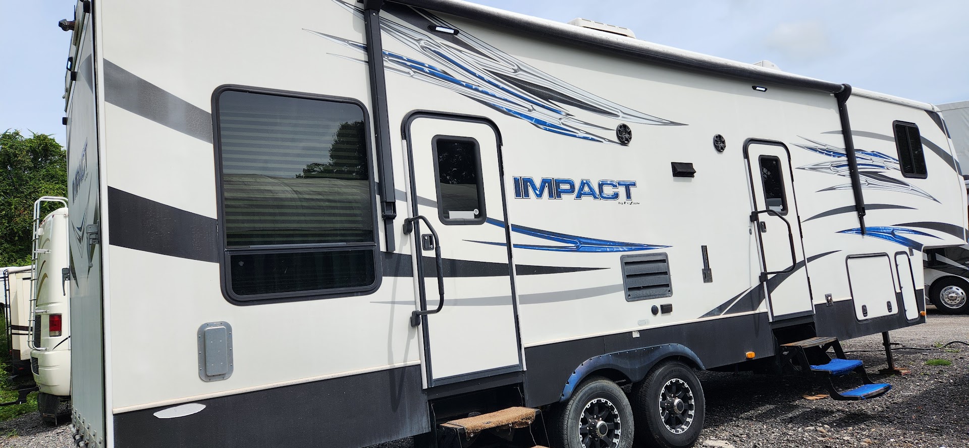 Ready to see some foliage or enjoy the cooler weather? Take this 2014 Keystone Impact anywhere you’d like to go and you’ll have everything you need. A 5th wheel with a toy hauler allows you to bring along your family and friends AND your toys, too! The homey interior will feel comfortable and cozy – when you enter, you’ll be greeted by the spacious kitchen with plenty of storage. The double well sink, oven, gas stove with three burners, large fridge, and microwave provide all the necessities of your kitchen at home. Pop over to the living area, prop your feet up on the comfy recliners, and flip on the large flatscreen TV for untimate relaxation. There is a bathroom that is accessable from both the living area and the spacious bedroom – featuring a king-size bed, overhead storage, nighstand, TV, and mirrored 3-door wardrobe with built-in dresser. Move toward the back, and there is a glass slider door leading to the toy-hauler area which houses a raised bed that can be converted into seating with optional table, and a third television. There’s plenty of room for your toys, and this camper features onboard fueling station for whatever toys you haul! Generator currently has 57.5 hours. Don’t miss out – all of this fun is waiting for you at RV Glamping today!