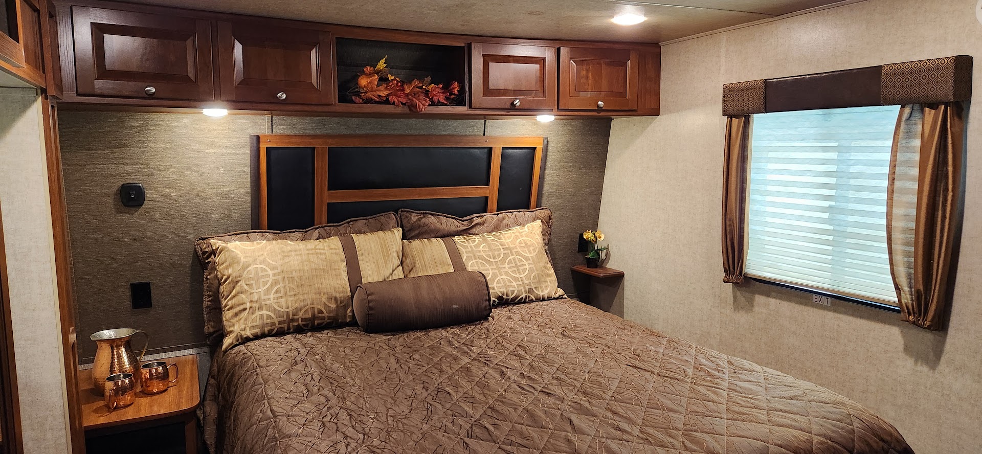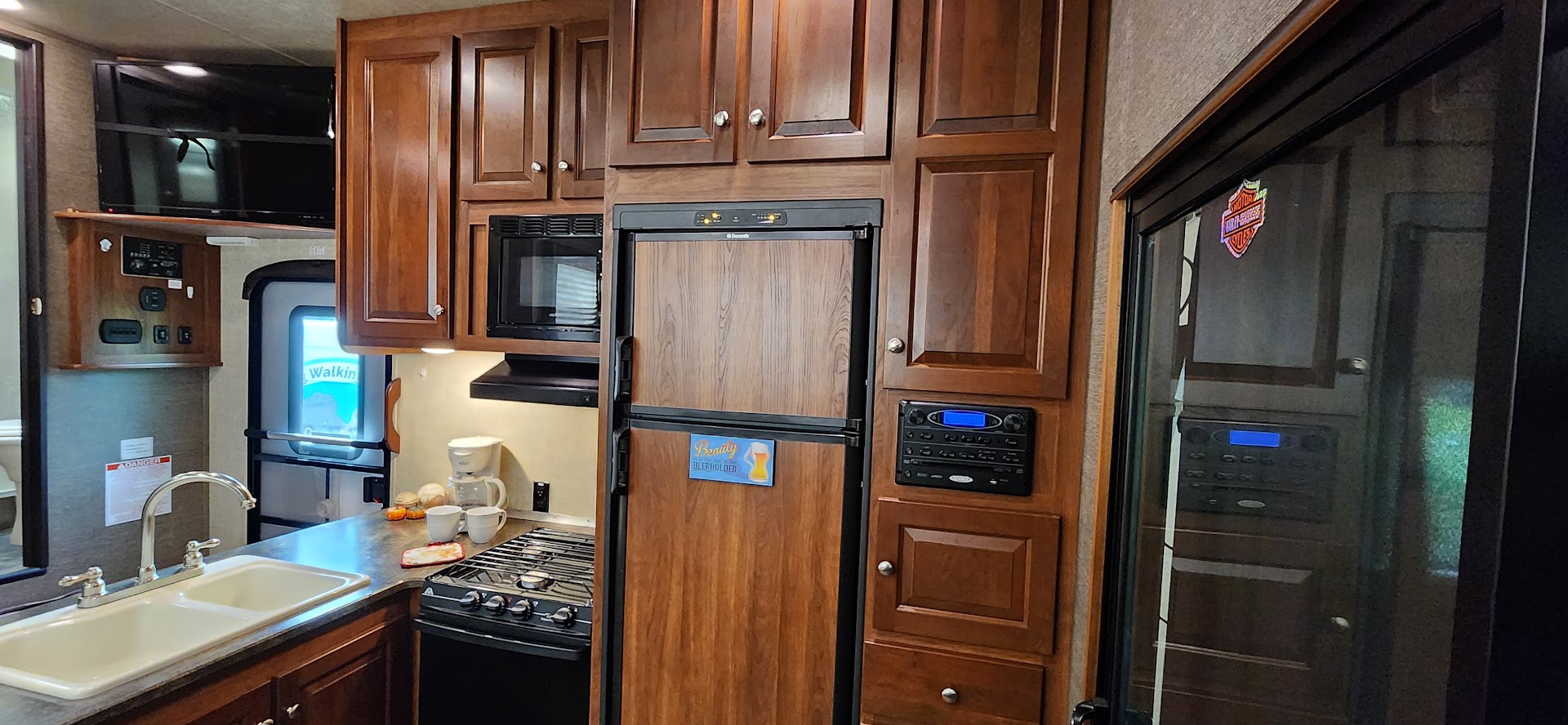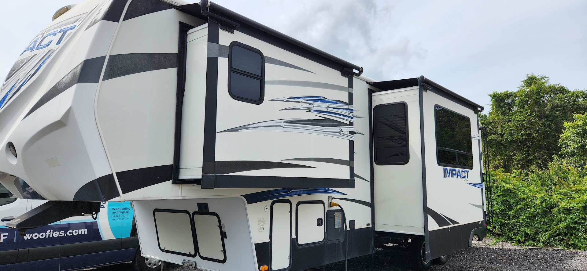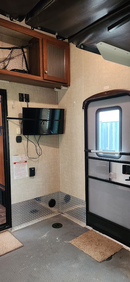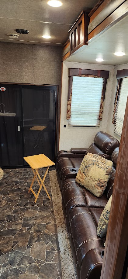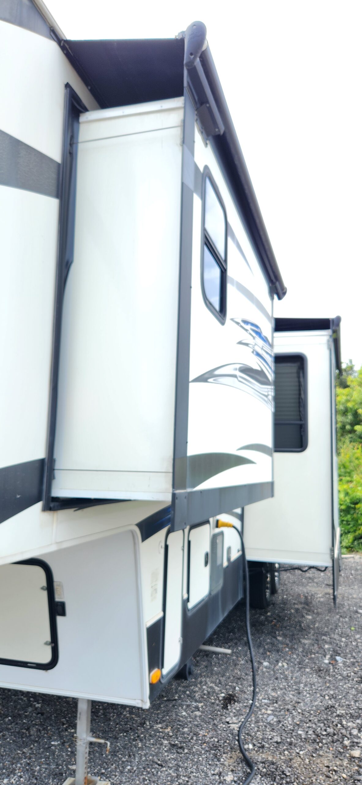 Ready to see some foliage or enjoy the cooler weather? Take this 2014 Keystone Impact anywhere you’d like to go and you’ll have everything you need. A 5th wheel with a toy hauler allows you to bring along your family and friends AND your toys, too! The homey interior will feel comfortable and cozy – when you enter, you’ll be greeted by the spacious kitchen with plenty of storage. The double well sink, oven, gas stove with three burners, large fridge, and microwave provide all the necessities of your kitchen at home. Pop over to the living area, prop your feet up on the comfy recliners, and flip on the large flatscreen TV for untimate relaxation. There is a bathroom that is accessable from both the living area and the spacious bedroom – featuring a king-size bed, overhead storage, nighstand, TV, and mirrored 3-door wardrobe with built-in dresser. Move toward the back, and there is a glass slider door leading to the toy-hauler area which houses a raised bed that can be converted into seating with optional table, and a third television. There’s plenty of room for your toys, and this camper features onboard fueling station for whatever toys you haul! Generator currently has 57.5 hours. Don’t miss out – all of this fun is waiting for you at RV Glamping today!