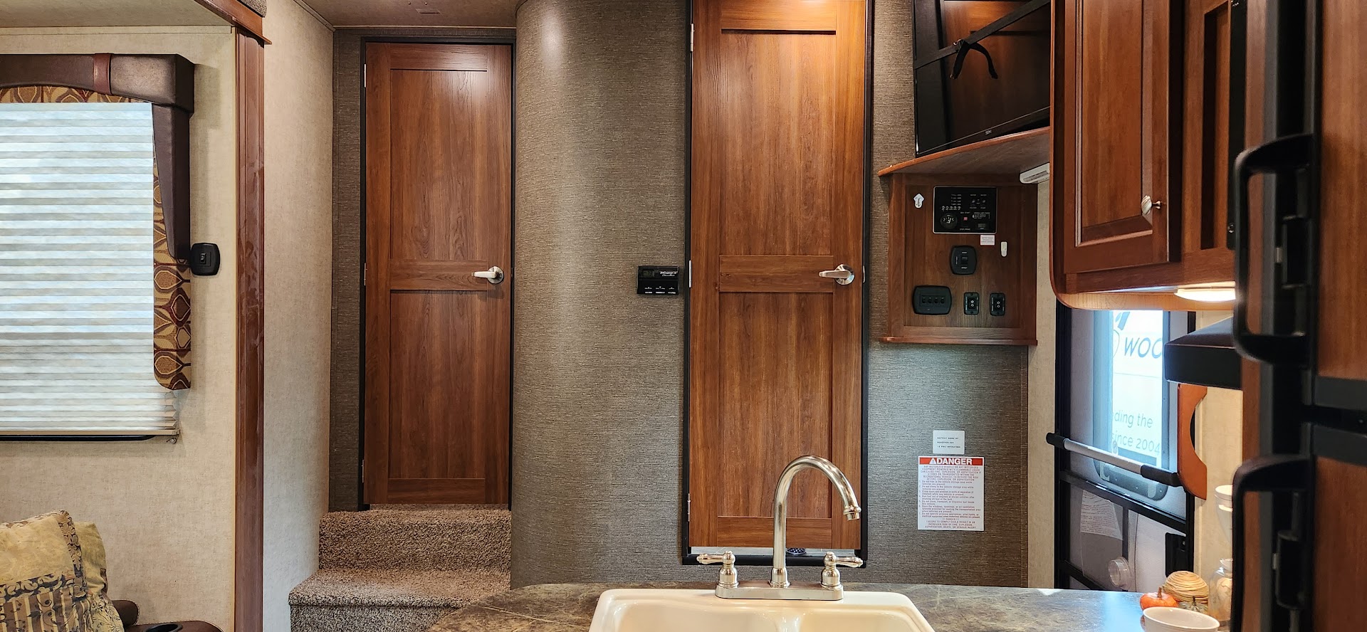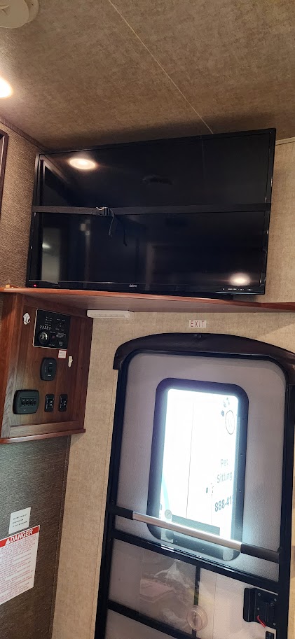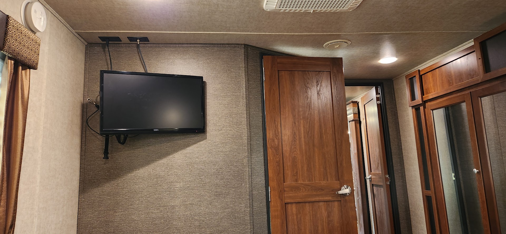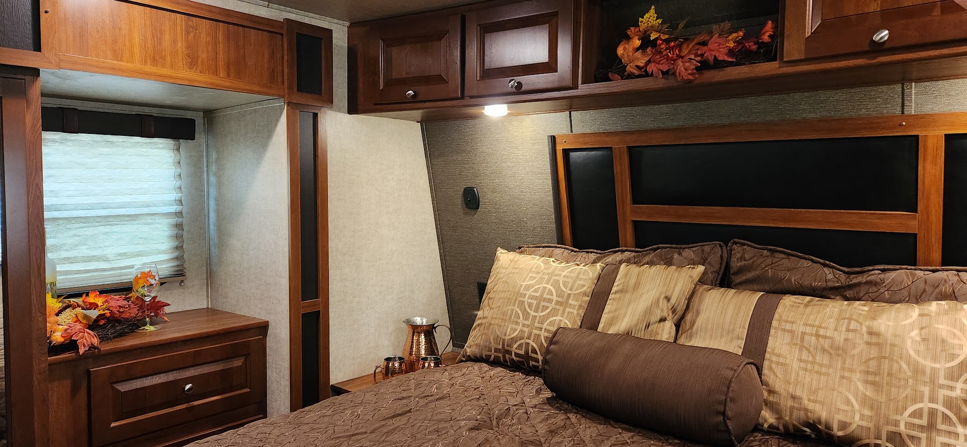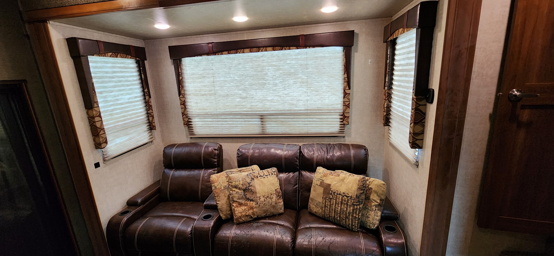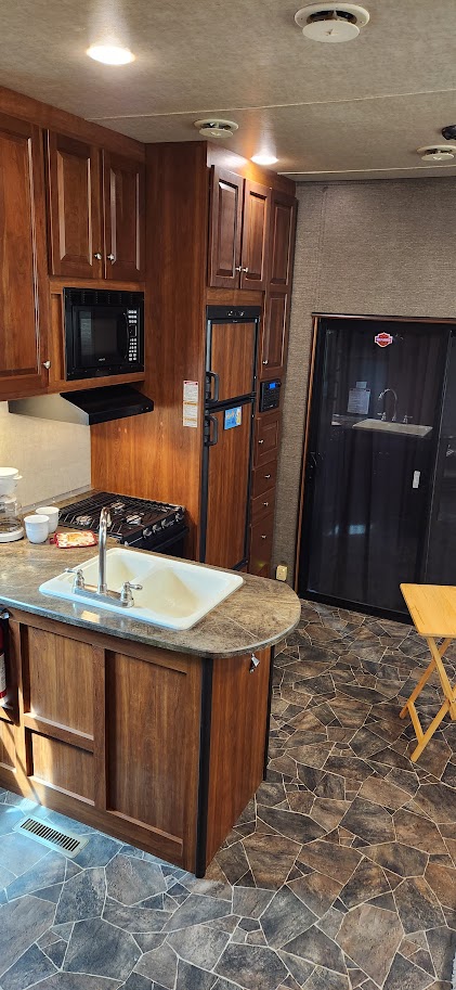 Ready to see some foliage or enjoy the cooler weather? Take this 2014 Keystone Impact anywhere you’d like to go and you’ll have everything you need. A 5th wheel with a toy hauler allows you to bring along your family and friends AND your toys, too! The homey interior will feel comfortable and cozy – when you enter, you’ll be greeted by the spacious kitchen with plenty of storage. The double well sink, oven, gas stove with three burners, large fridge, and microwave provide all the necessities of your kitchen at home. Pop over to the living area, prop your feet up on the comfy recliners, and flip on the large flatscreen TV for untimate relaxation. There is a bathroom that is accessable from both the living area and the spacious bedroom – featuring a king-size bed, overhead storage, nighstand, TV, and mirrored 3-door wardrobe with built-in dresser. Move toward the back, and there is a glass slider door leading to the toy-hauler area which houses a raised bed that can be converted into seating with optional table, and a third television. There’s plenty of room for your toys, and this camper features onboard fueling station for whatever toys you haul! Generator currently has 57.5 hours. Don’t miss out – all of this fun is waiting for you at RV Glamping today!
