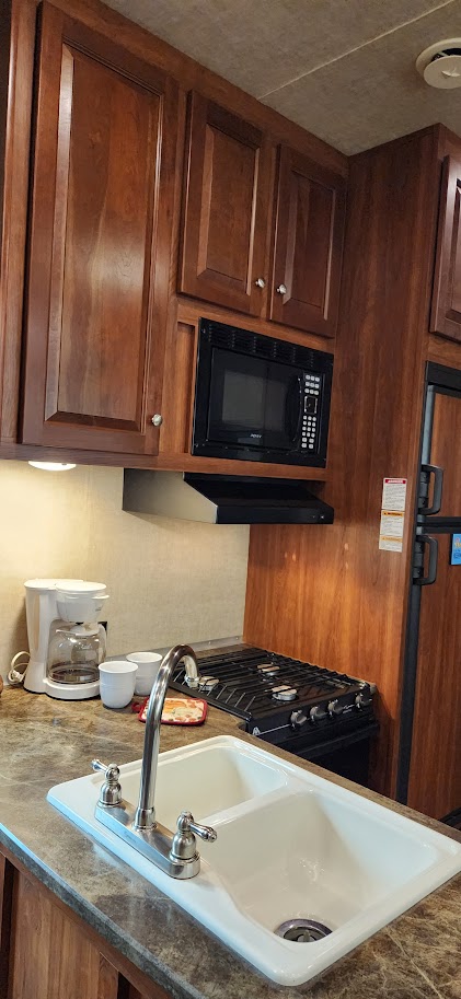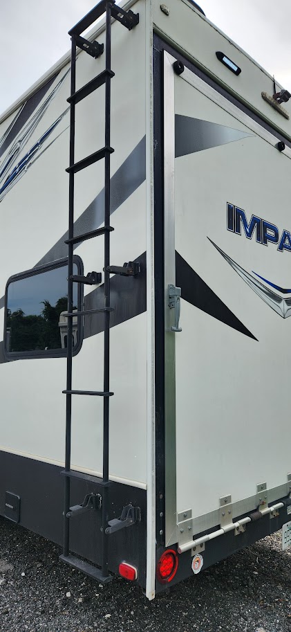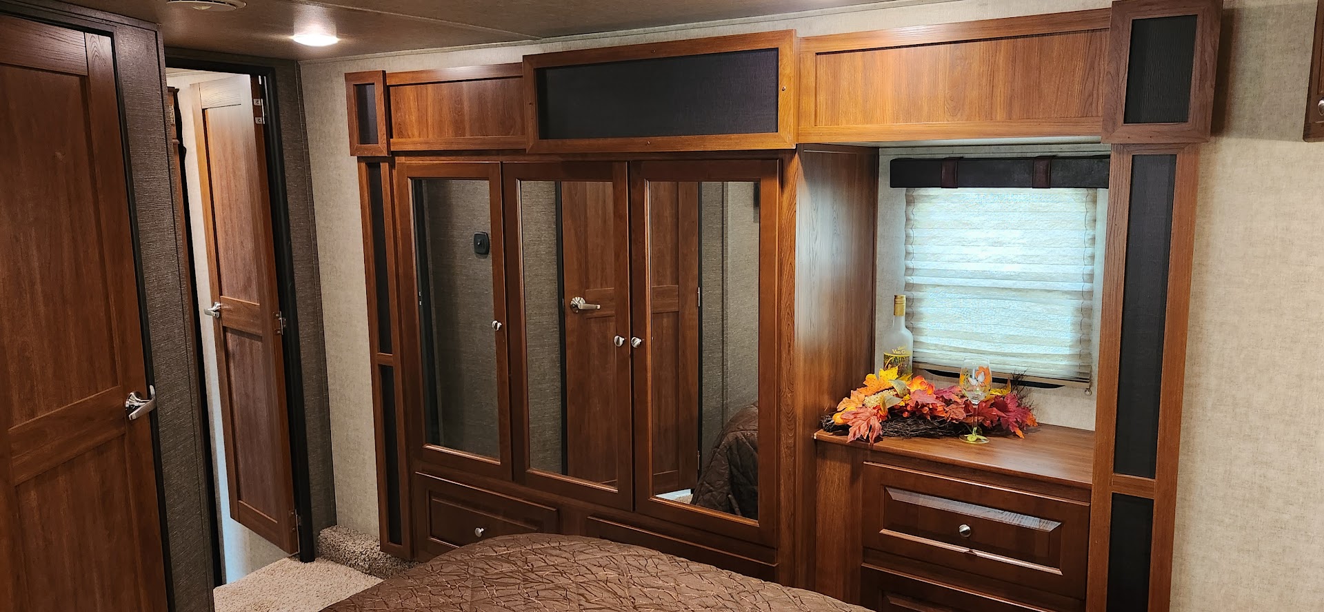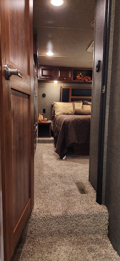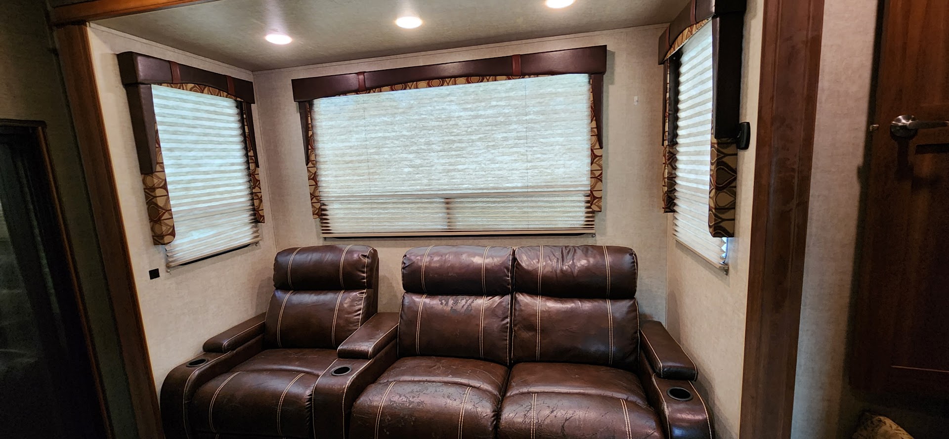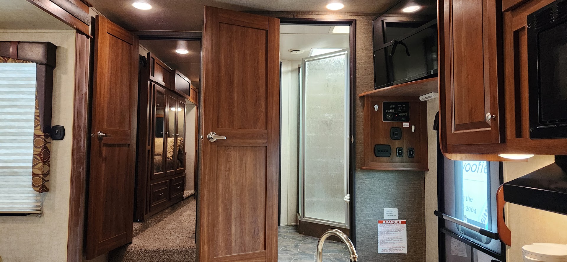 Ready to see some foliage or enjoy the cooler weather? Take this 2014 Keystone Impact anywhere you’d like to go and you’ll have everything you need. A 5th wheel with a toy hauler allows you to bring along your family and friends AND your toys, too! The homey interior will feel comfortable and cozy – when you enter, you’ll be greeted by the spacious kitchen with plenty of storage. The double well sink, oven, gas stove with three burners, large fridge, and microwave provide all the necessities of your kitchen at home. Pop over to the living area, prop your feet up on the comfy recliners, and flip on the large flatscreen TV for untimate relaxation. There is a bathroom that is accessable from both the living area and the spacious bedroom – featuring a king-size bed, overhead storage, nighstand, TV, and mirrored 3-door wardrobe with built-in dresser. Move toward the back, and there is a glass slider door leading to the toy-hauler area which houses a raised bed that can be converted into seating with optional table, and a third television. There’s plenty of room for your toys, and this camper features onboard fueling station for whatever toys you haul! Generator currently has 57.5 hours. Don’t miss out – all of this fun is waiting for you at RV Glamping today!