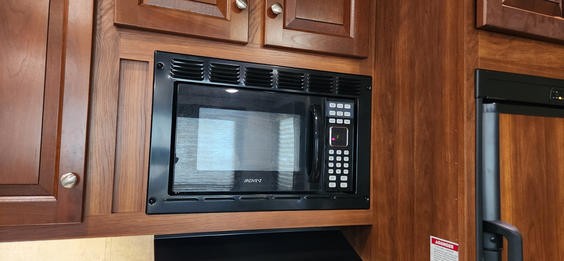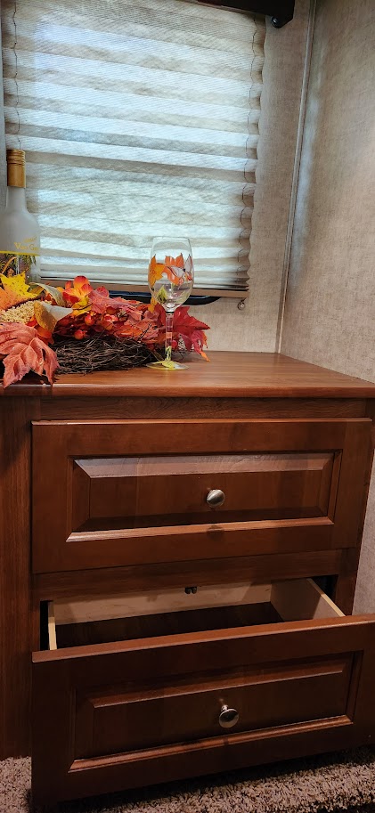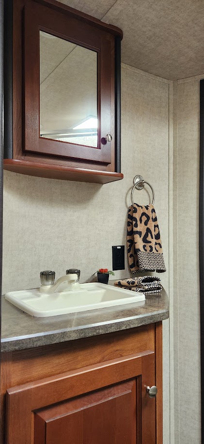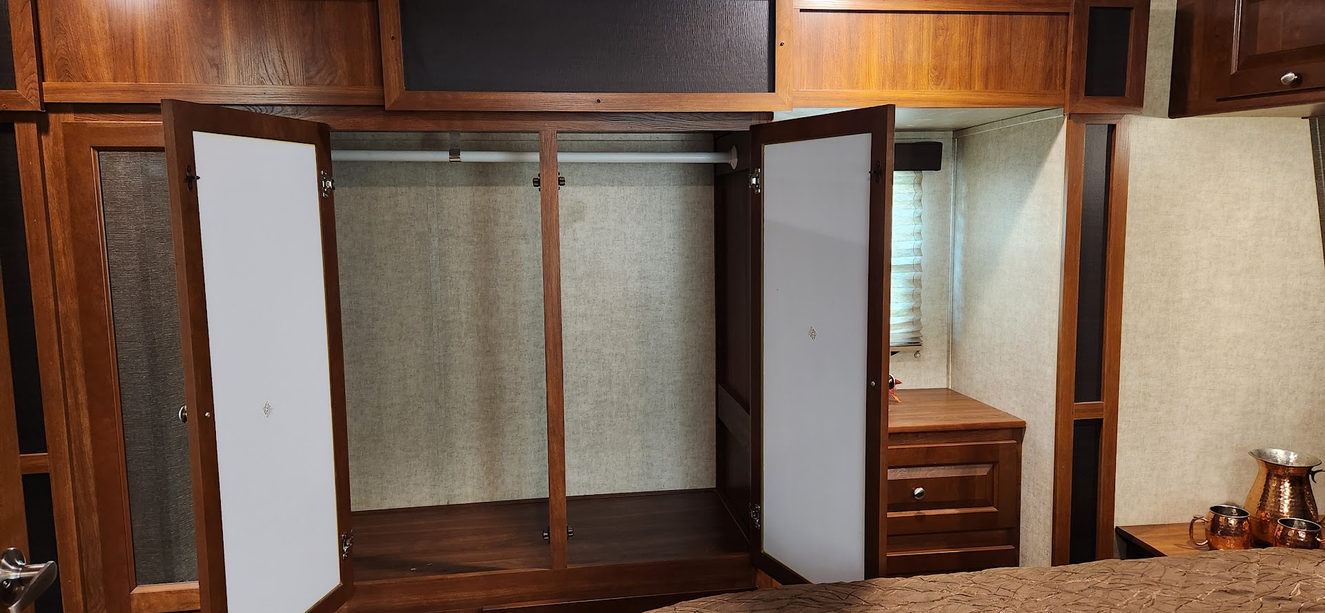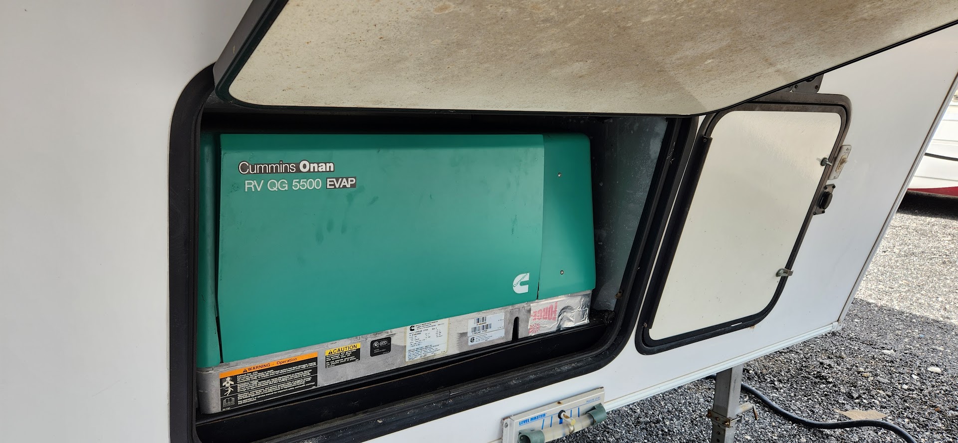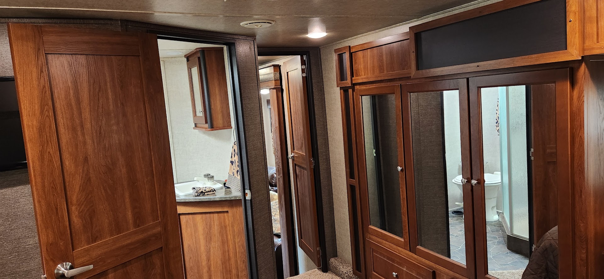 Ready to see some foliage or enjoy the cooler weather? Take this 2014 Keystone Impact anywhere you’d like to go and you’ll have everything you need. A 5th wheel with a toy hauler allows you to bring along your family and friends AND your toys, too! The homey interior will feel comfortable and cozy – when you enter, you’ll be greeted by the spacious kitchen with plenty of storage. The double well sink, oven, gas stove with three burners, large fridge, and microwave provide all the necessities of your kitchen at home. Pop over to the living area, prop your feet up on the comfy recliners, and flip on the large flatscreen TV for untimate relaxation. There is a bathroom that is accessable from both the living area and the spacious bedroom – featuring a king-size bed, overhead storage, nighstand, TV, and mirrored 3-door wardrobe with built-in dresser. Move toward the back, and there is a glass slider door leading to the toy-hauler area which houses a raised bed that can be converted into seating with optional table, and a third television. There’s plenty of room for your toys, and this camper features onboard fueling station for whatever toys you haul! Generator currently has 57.5 hours. Don’t miss out – all of this fun is waiting for you at RV Glamping today!