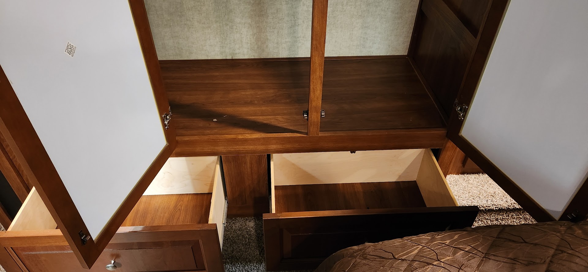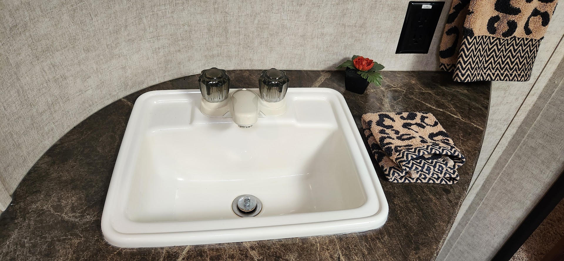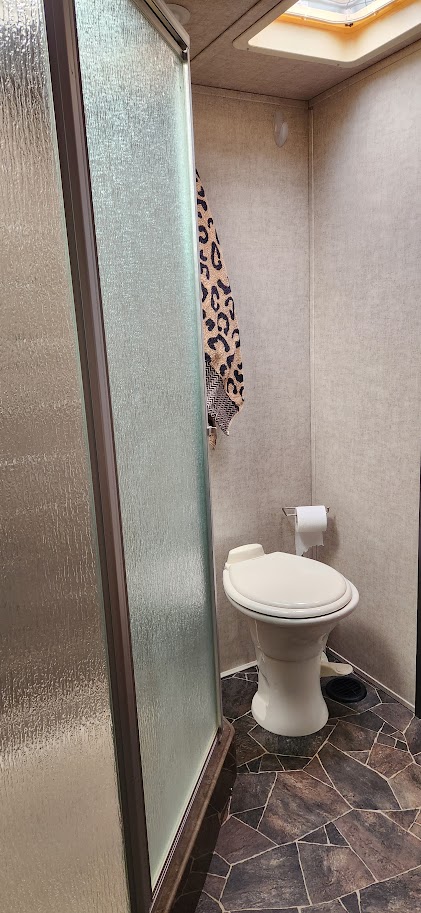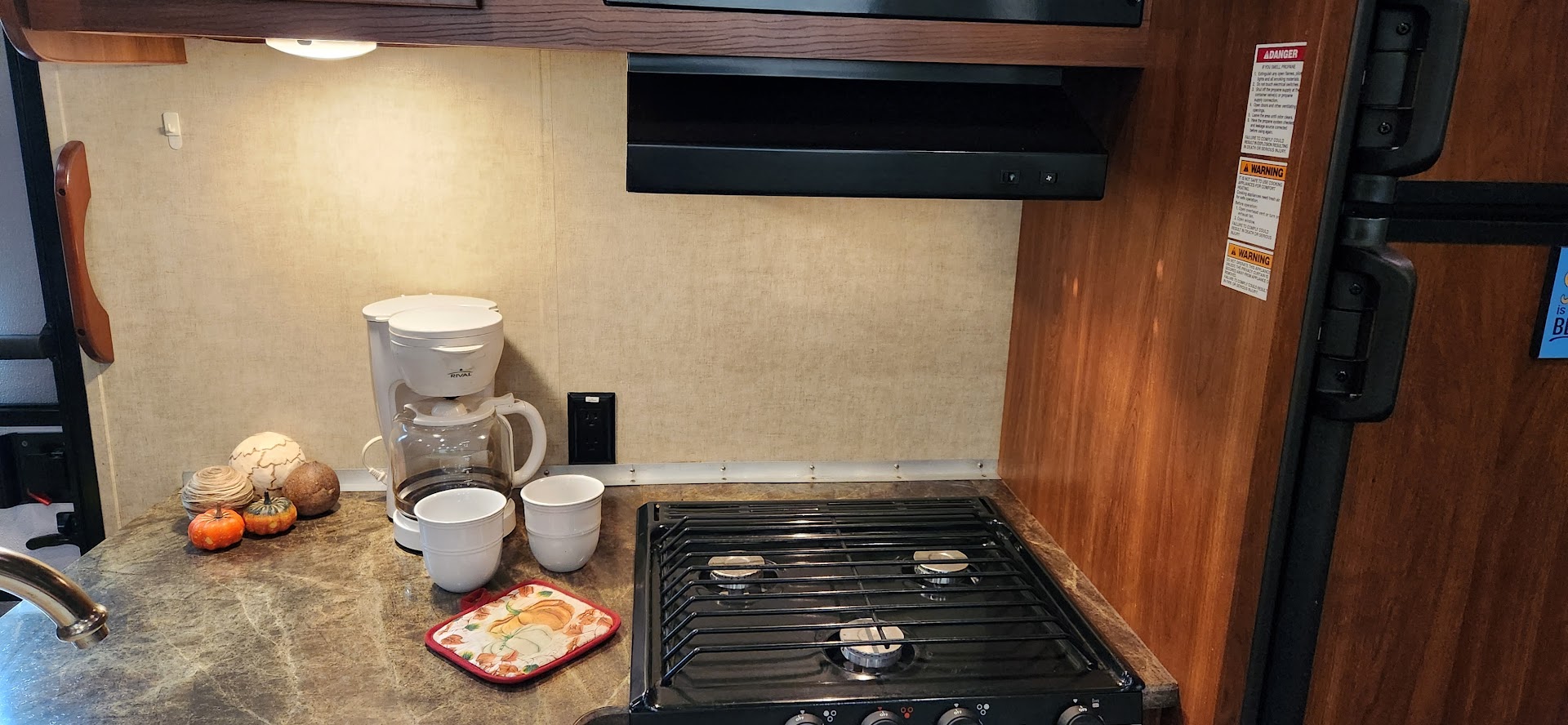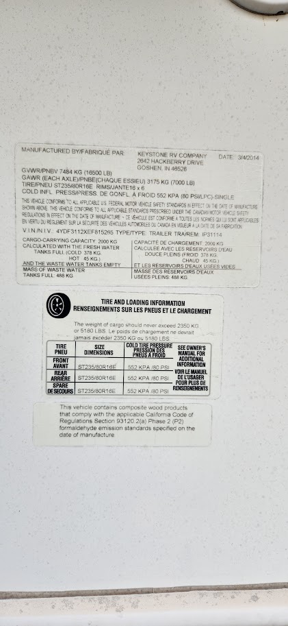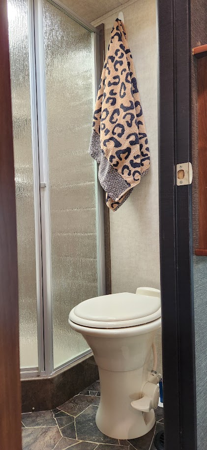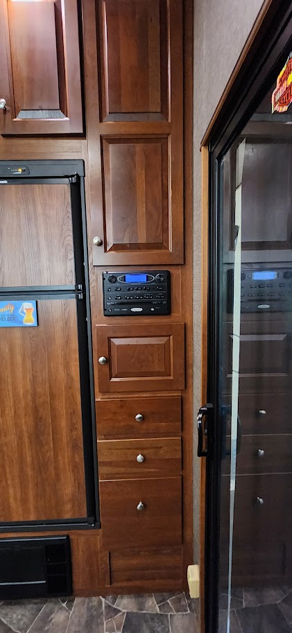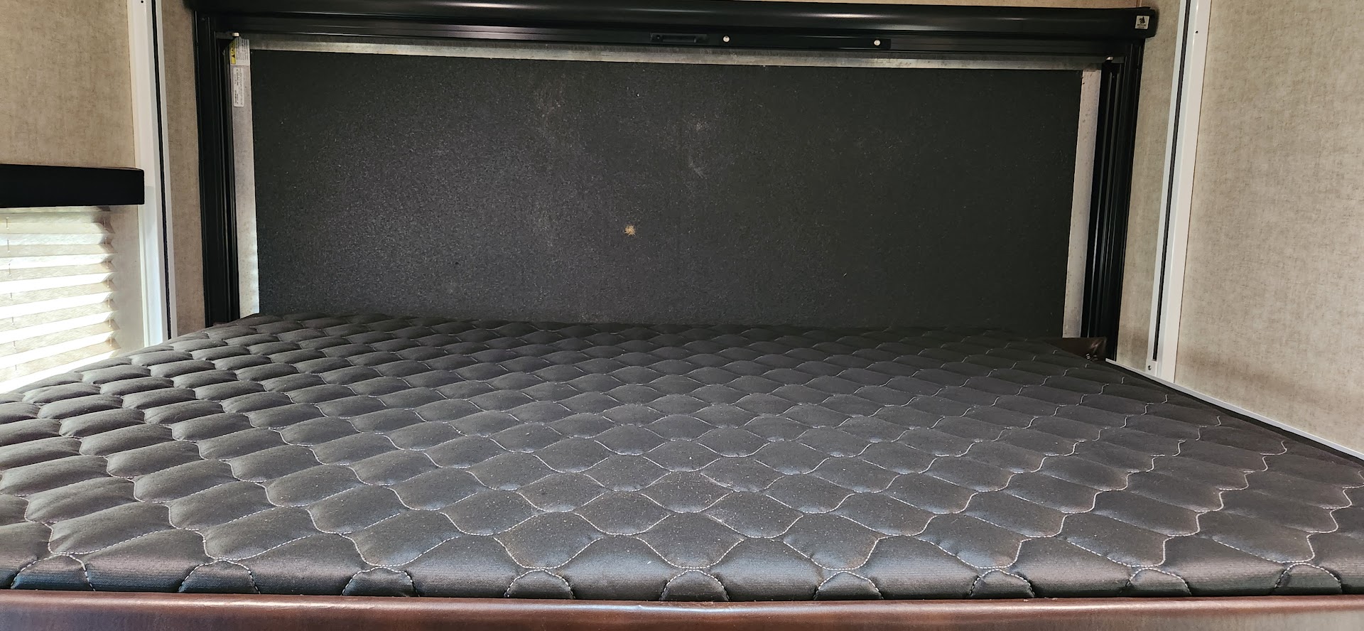 Ready to see some foliage or enjoy the cooler weather? Take this 2014 Keystone Impact anywhere you’d like to go and you’ll have everything you need. A 5th wheel with a toy hauler allows you to bring along your family and friends AND your toys, too! The homey interior will feel comfortable and cozy – when you enter, you’ll be greeted by the spacious kitchen with plenty of storage. The double well sink, oven, gas stove with three burners, large fridge, and microwave provide all the necessities of your kitchen at home. Pop over to the living area, prop your feet up on the comfy recliners, and flip on the large flatscreen TV for untimate relaxation. There is a bathroom that is accessable from both the living area and the spacious bedroom – featuring a king-size bed, overhead storage, nighstand, TV, and mirrored 3-door wardrobe with built-in dresser. Move toward the back, and there is a glass slider door leading to the toy-hauler area which houses a raised bed that can be converted into seating with optional table, and a third television. There’s plenty of room for your toys, and this camper features onboard fueling station for whatever toys you haul! Generator currently has 57.5 hours. Don’t miss out – all of this fun is waiting for you at RV Glamping today!