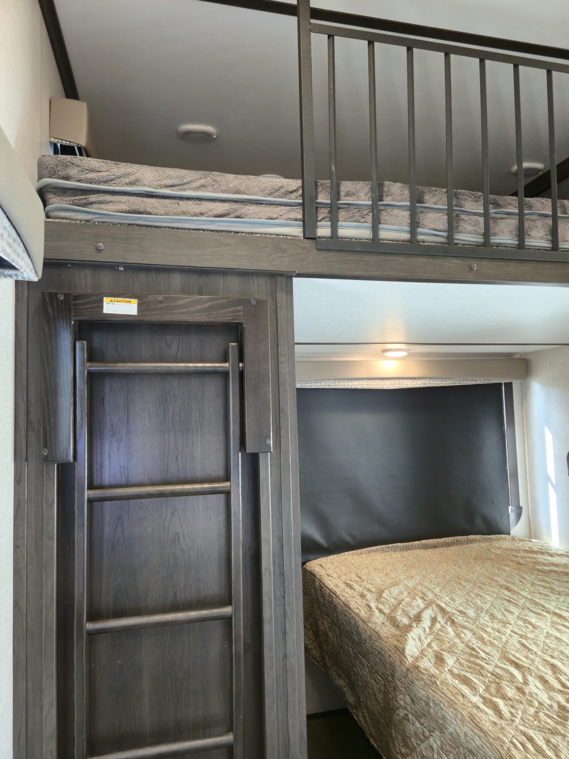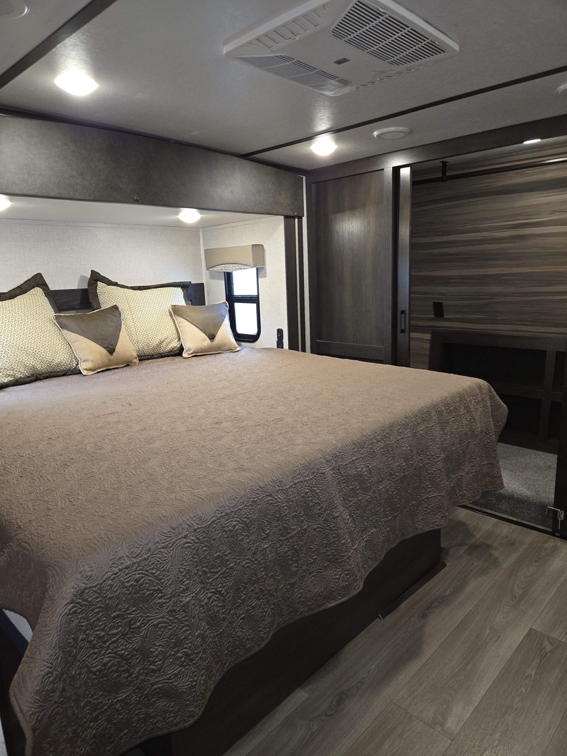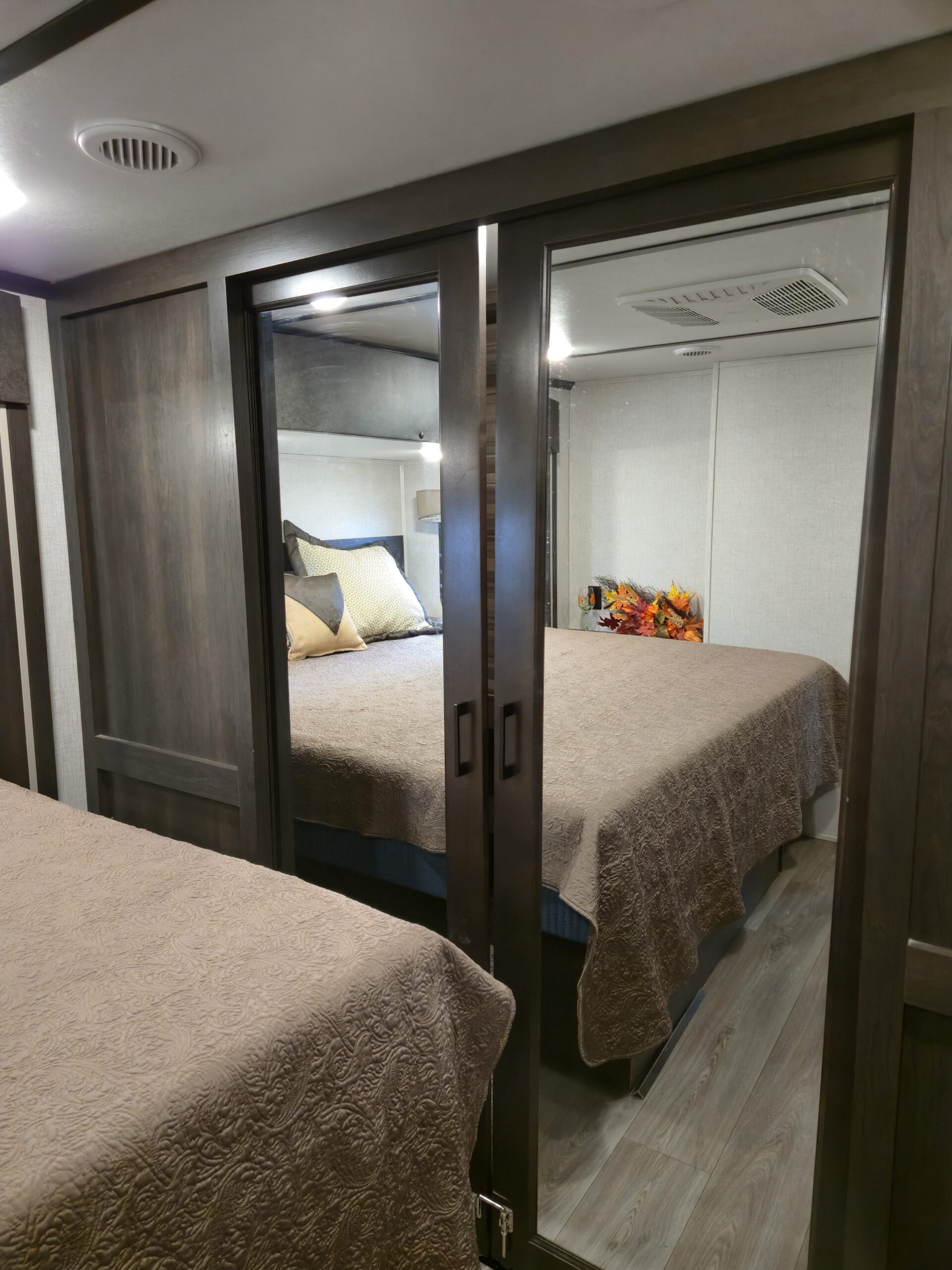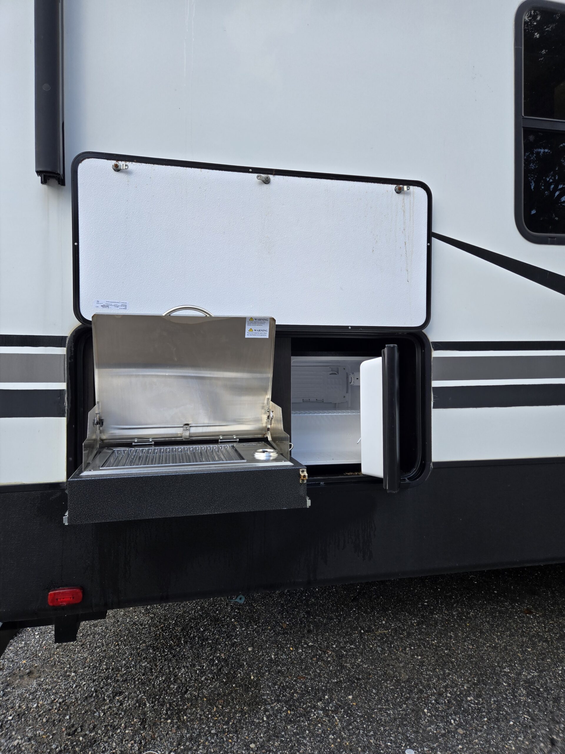 This 2021 Crossroads Cruiser is new to the lot and ready to impress you with lots of space, modern finishes, and comfort at every corner. Come inside the main entrance and be greeted by the main living area that is sure to please. From the large kitchen featuring center island and beautiful stainless steel appliances (full size fridge/freezer, oven/stove with 3 burners, single bowl farmhouse sink, 30″ residential size microwave and a huge pantry with beautiful glass panel double doors. THe adjacent dinette and leather recliners offer ample room for meal time and relaxation – complete with an electic fireplace that adds warmth and ambiance to the whole living area. Head up the stairs and you’ll find the spacious main bathroom with a 48×30 shower, sink with medicine cabinet, toilet and linen closet. The large bedroom has a king size bed, huge closet with mirrored doors offer tons of storage space and washer/dryer hookups. The dresser with seat and flat screen television complete the room. At the back of the camper, there is an additional area that can be closed off for privacy and offers it’s own entrance from outside. This area includes a half bathroom with sink and toilet, and a bedroom with a full size bed and bunk above. And the amenities don’t stop there! Enjoy the outdoors even more with the never-used outdoor kitchen area – the stove and mini-fridge have never even been used! Don’t miss out on this impressive 5th wheel – come see it today at RV Glamping!