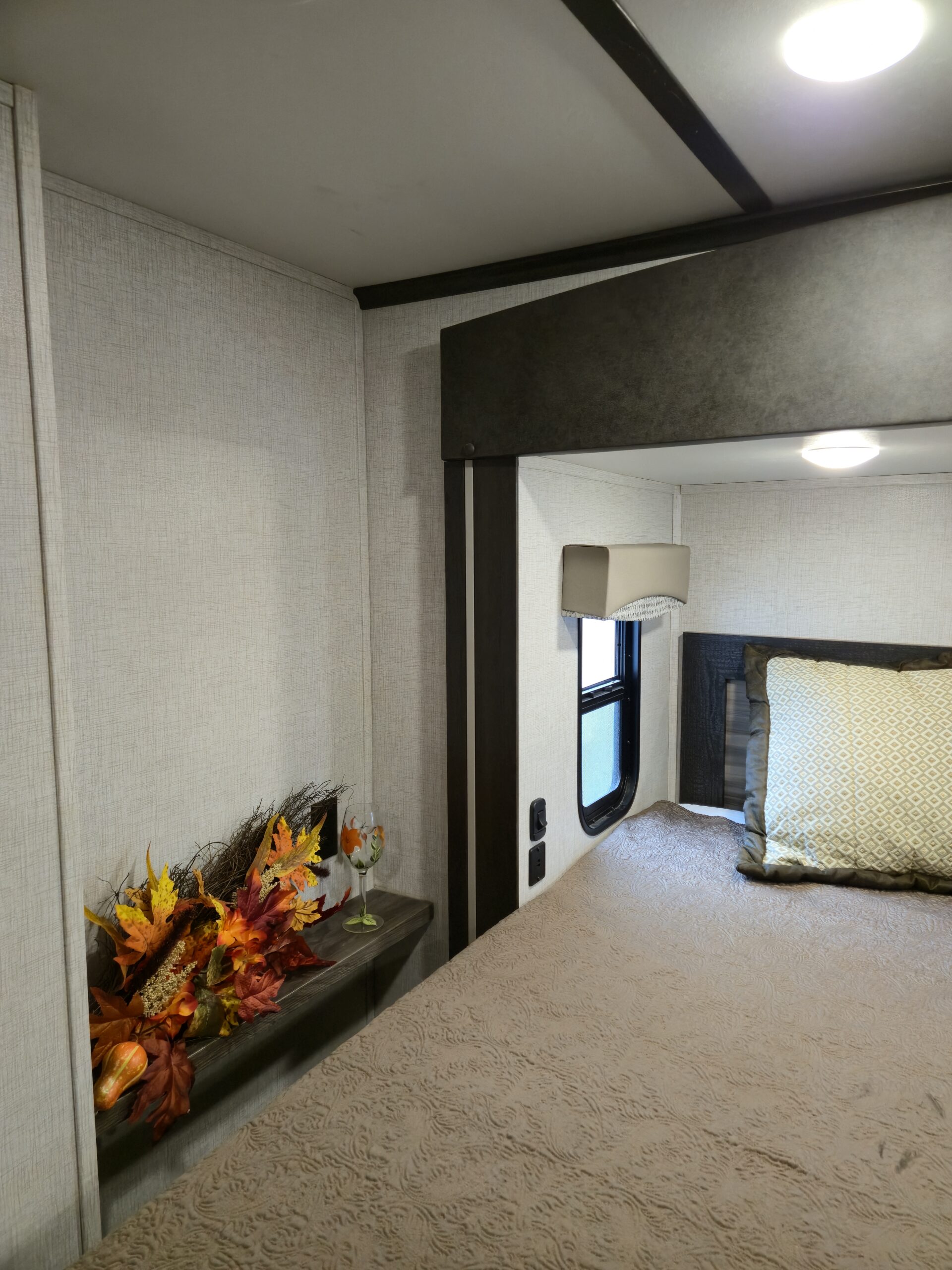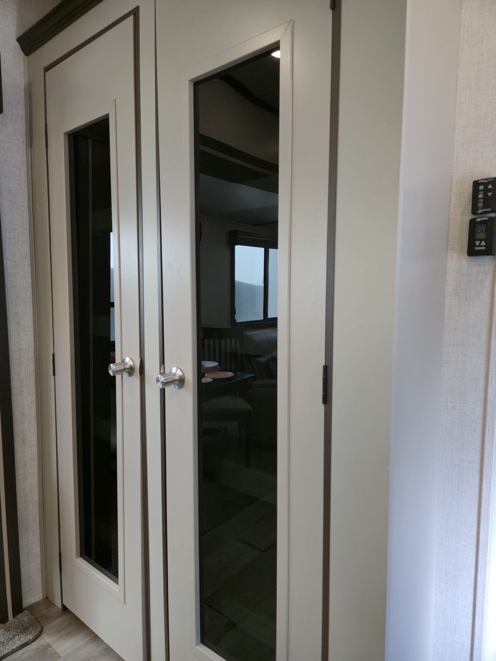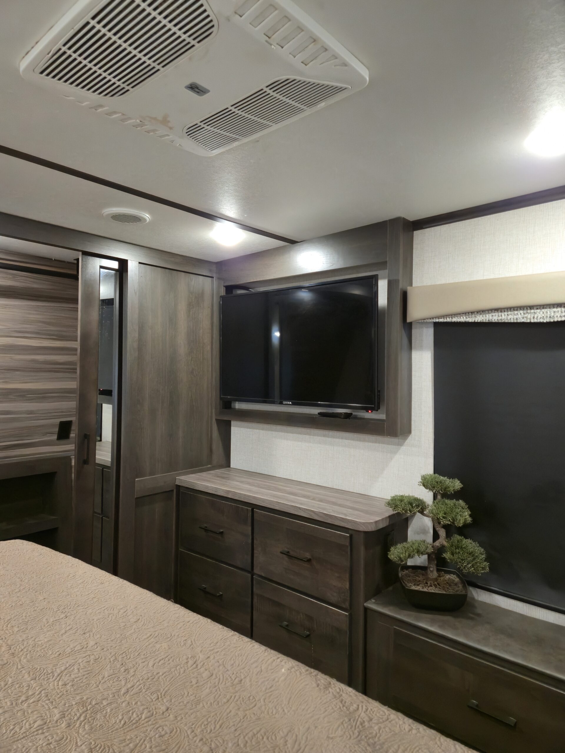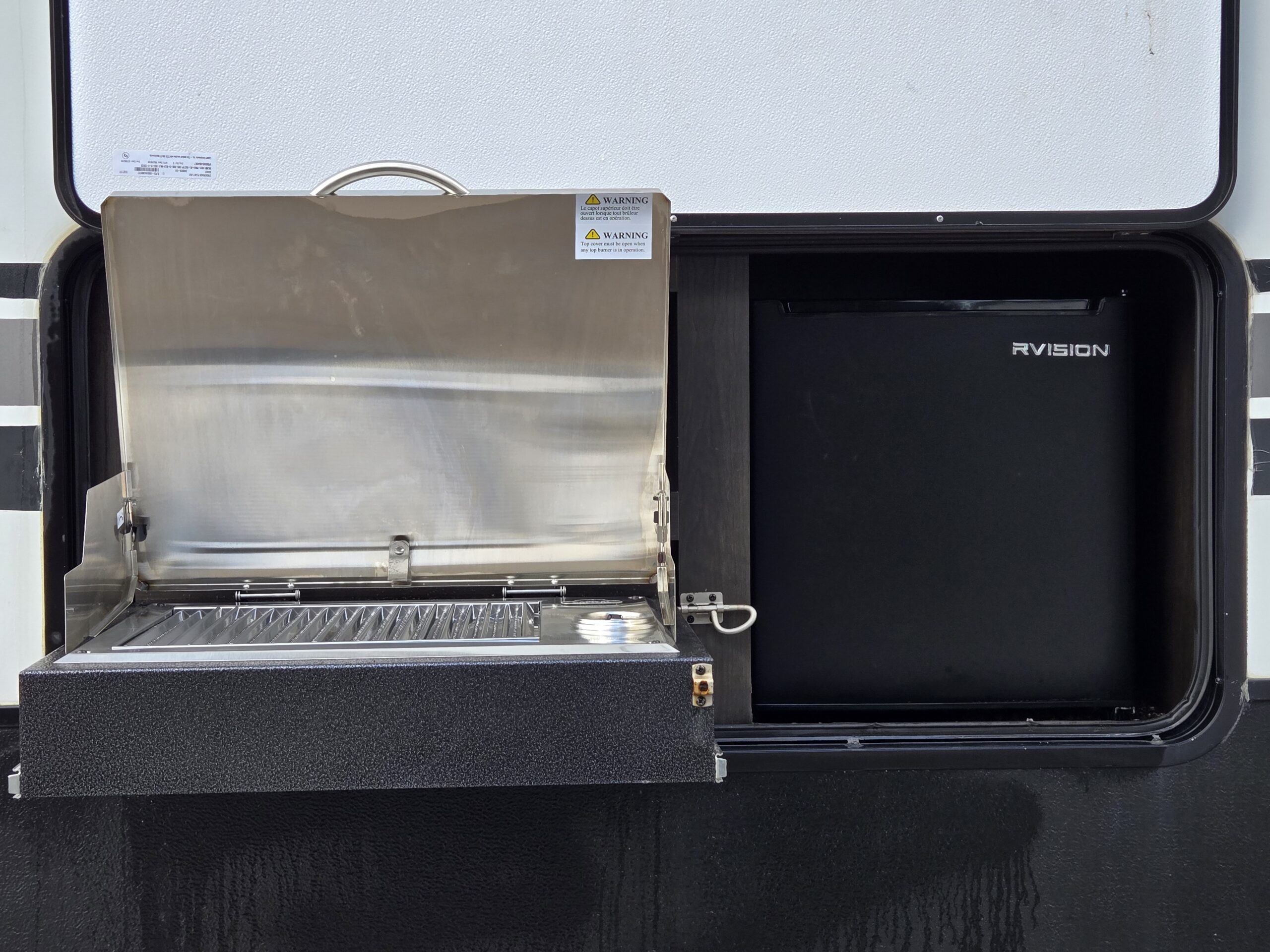 This 2021 Crossroads Cruiser is new to the lot and ready to impress you with lots of space, modern finishes, and comfort at every corner. Come inside the main entrance and be greeted by the main living area that is sure to please. From the large kitchen featuring center island and beautiful stainless steel appliances (full size fridge/freezer, oven/stove with 3 burners, single bowl farmhouse sink, 30″ residential size microwave and a huge pantry with beautiful glass panel double doors. THe adjacent dinette and leather recliners offer ample room for meal time and relaxation – complete with an electic fireplace that adds warmth and ambiance to the whole living area. Head up the stairs and you’ll find the spacious main bathroom with a 48×30 shower, sink with medicine cabinet, toilet and linen closet. The large bedroom has a king size bed, huge closet with mirrored doors offer tons of storage space and washer/dryer hookups. The dresser with seat and flat screen television complete the room. At the back of the camper, there is an additional area that can be closed off for privacy and offers it’s own entrance from outside. This area includes a half bathroom with sink and toilet, and a bedroom with a full size bed and bunk above. And the amenities don’t stop there! Enjoy the outdoors even more with the never-used outdoor kitchen area – the stove and mini-fridge have never even been used! Don’t miss out on this impressive 5th wheel – come see it today at RV Glamping!