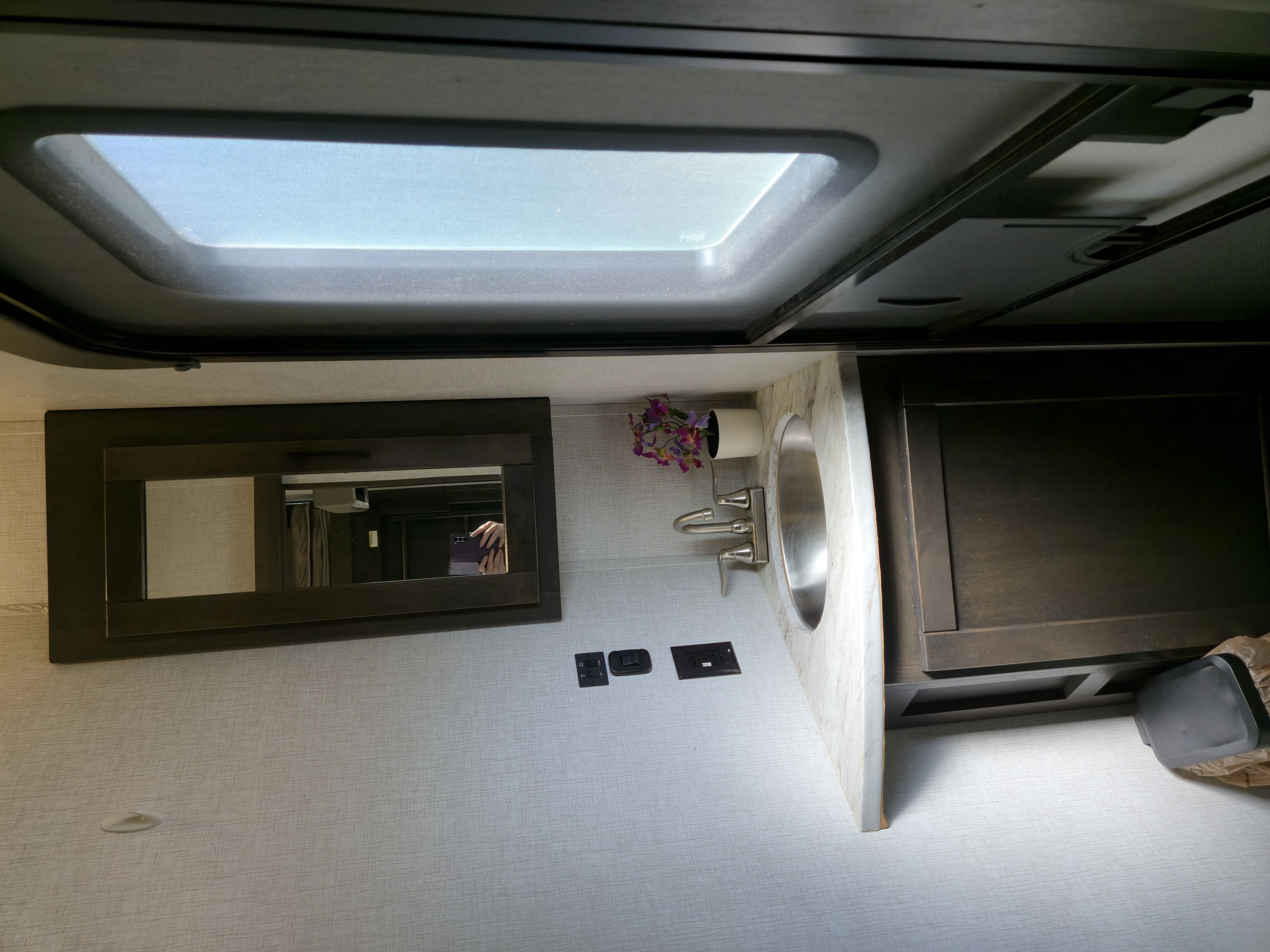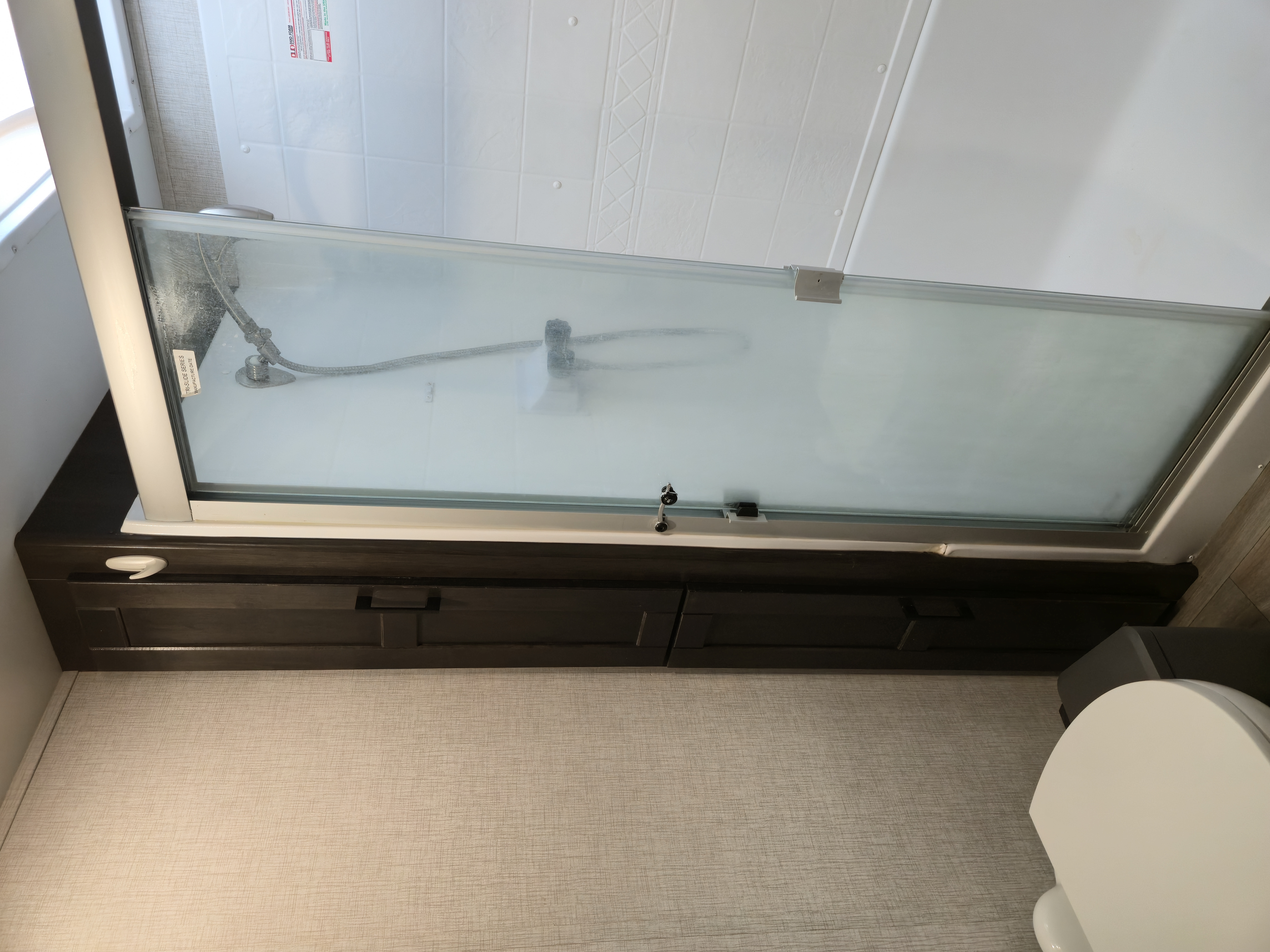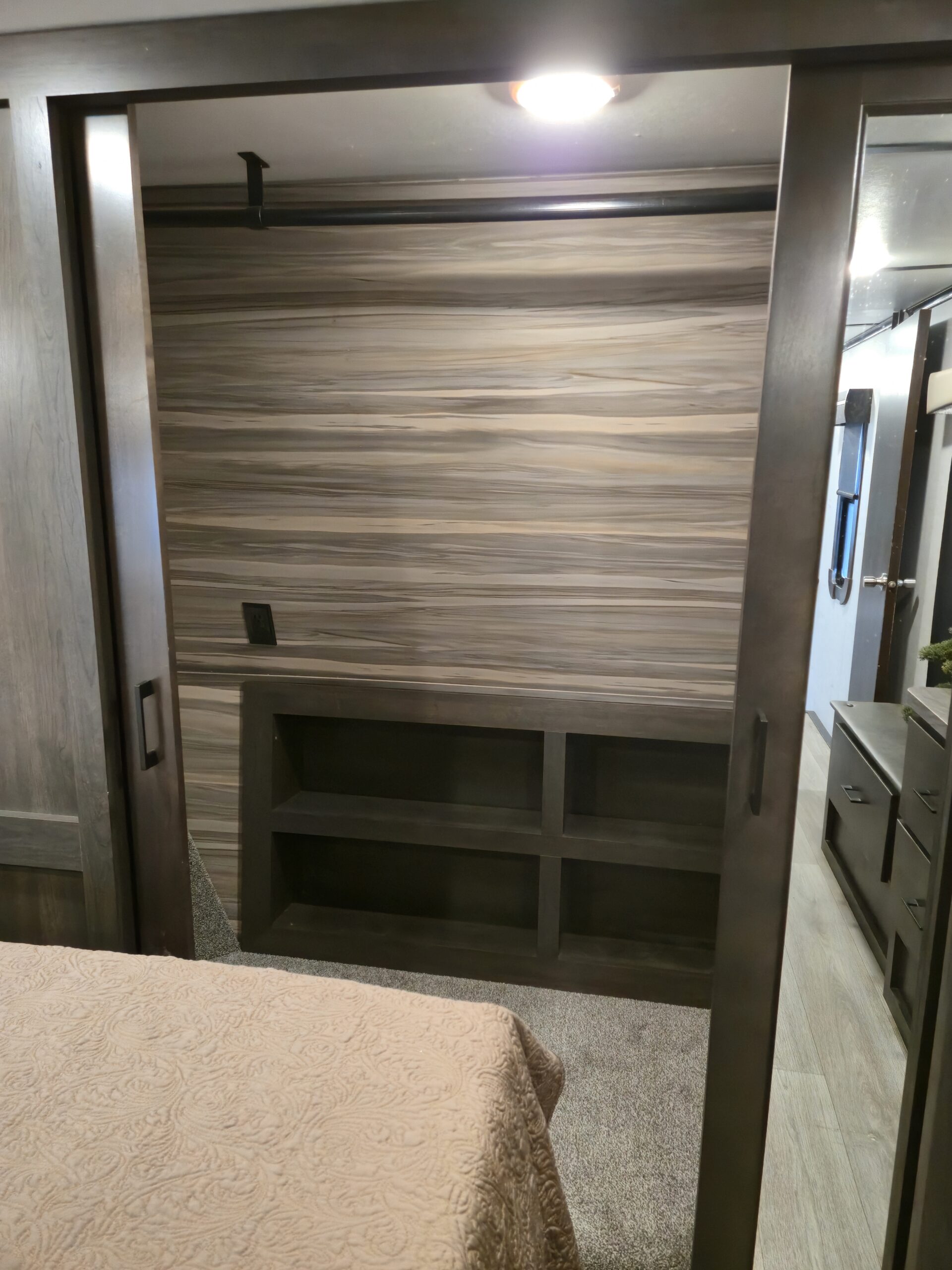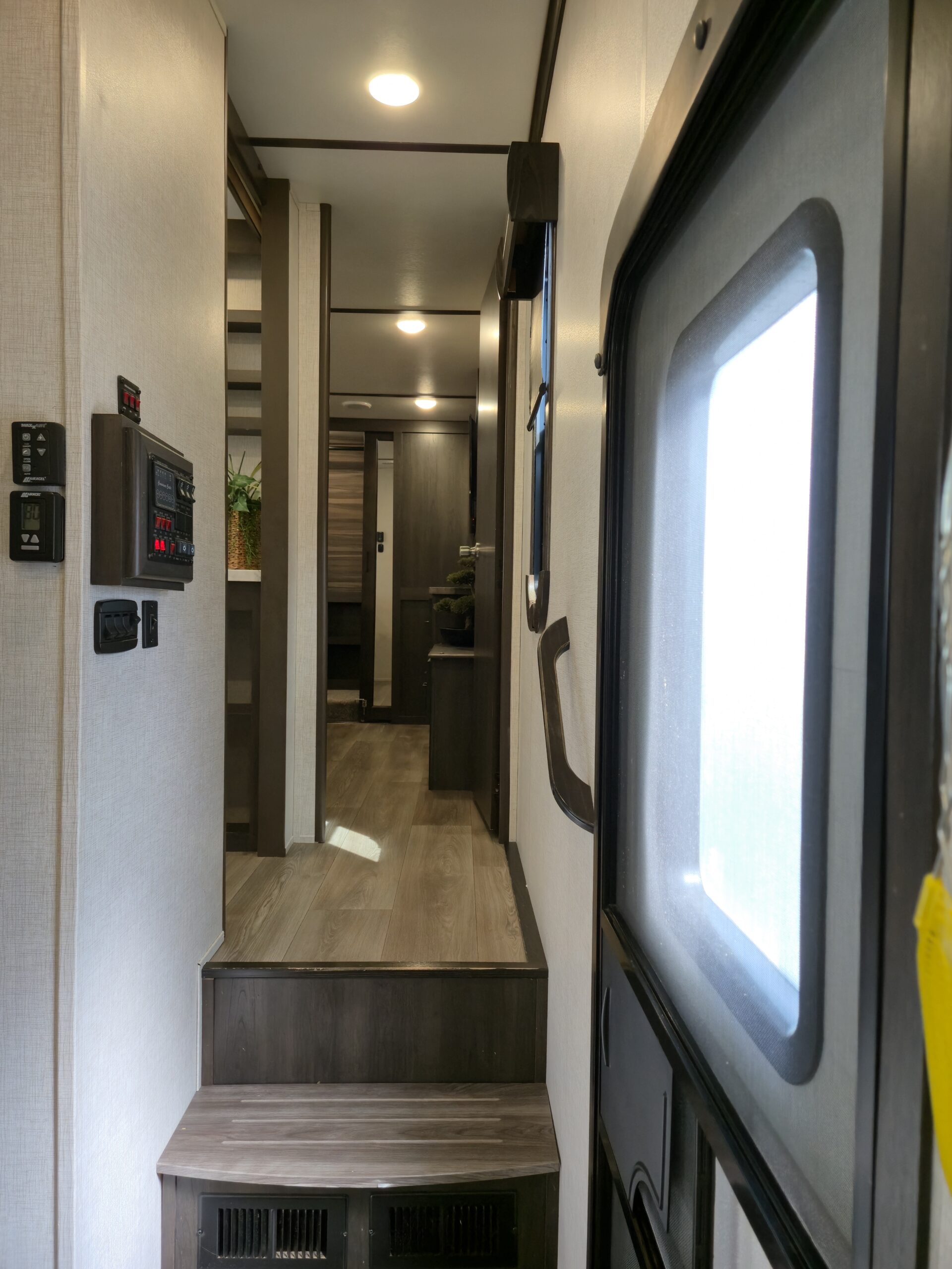 This 2021 Crossroads Cruiser is new to the lot and ready to impress you with lots of space, modern finishes, and comfort at every corner. Come inside the main entrance and be greeted by the main living area that is sure to please. From the large kitchen featuring center island and beautiful stainless steel appliances (full size fridge/freezer, oven/stove with 3 burners, single bowl farmhouse sink, 30″ residential size microwave and a huge pantry with beautiful glass panel double doors. THe adjacent dinette and leather recliners offer ample room for meal time and relaxation – complete with an electic fireplace that adds warmth and ambiance to the whole living area. Head up the stairs and you’ll find the spacious main bathroom with a 48×30 shower, sink with medicine cabinet, toilet and linen closet. The large bedroom has a king size bed, huge closet with mirrored doors offer tons of storage space and washer/dryer hookups. The dresser with seat and flat screen television complete the room. At the back of the camper, there is an additional area that can be closed off for privacy and offers it’s own entrance from outside. This area includes a half bathroom with sink and toilet, and a bedroom with a full size bed and bunk above. And the amenities don’t stop there! Enjoy the outdoors even more with the never-used outdoor kitchen area – the stove and mini-fridge have never even been used! Don’t miss out on this impressive 5th wheel – come see it today at RV Glamping!